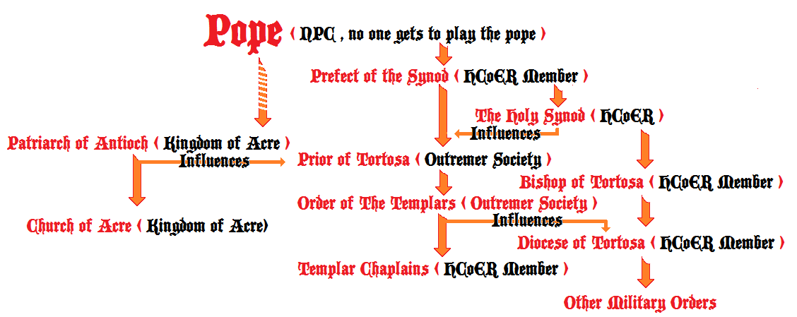 The practices in the Outremer looked much more Orthodox than Catholic to a modern observer but was still catholic. To simplify things we have the "Holy Church of Tortosa" that is made up of Members of the Holy Curia of Ecclesiastical Reenactors. Different branches have influence as listed on the chart below.
